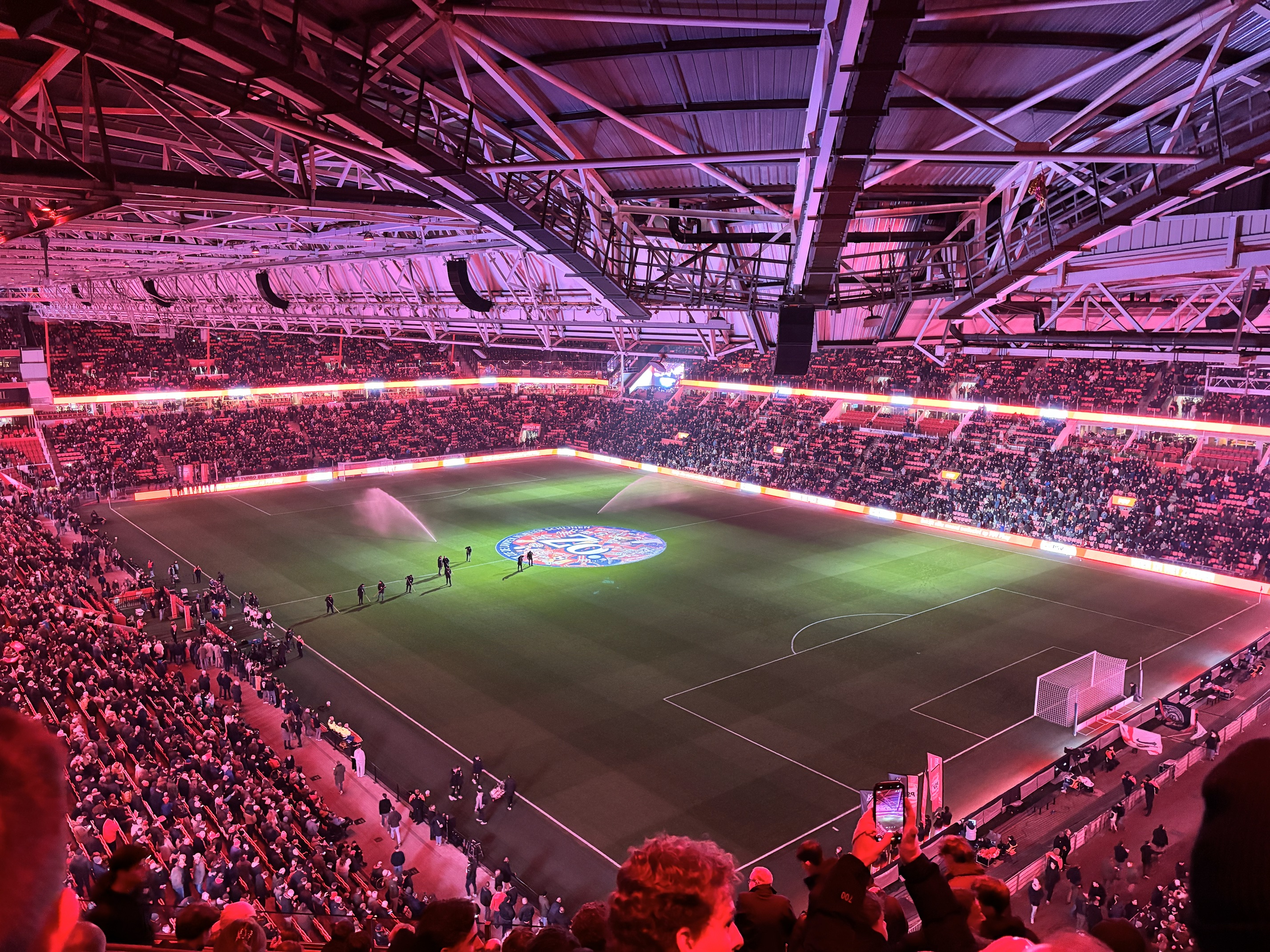 Efter ankomst og check-in på hotellet gik turen mod stadion – en frisk gåtur på cirka 25–30 minutter. Kulden bed, men det blev hurtigt glemt, da kampen leverede underholdning: 4 mål, alle i “vores” ende, og et flot 2–2-resultat. Kampen blev spillet foran næsten udsolgte tribuner med 24.688 tilskuere på SchücoArena.